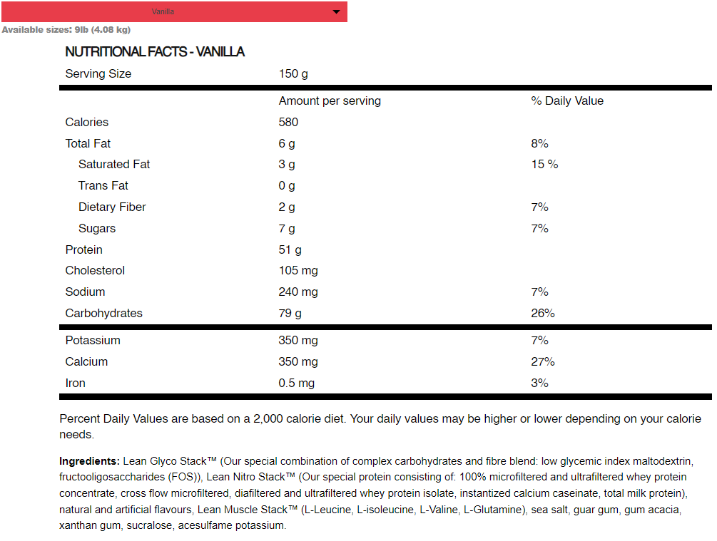 - 糖份及脂肪比例極低,有效增加肌肉量,同時保持相對較低的脂肪水平