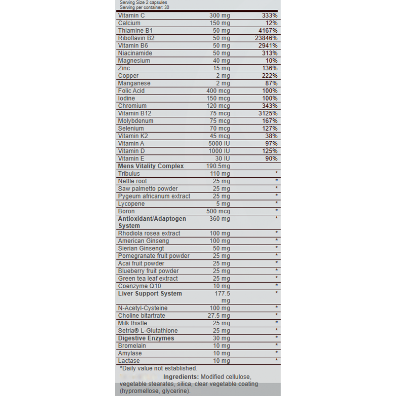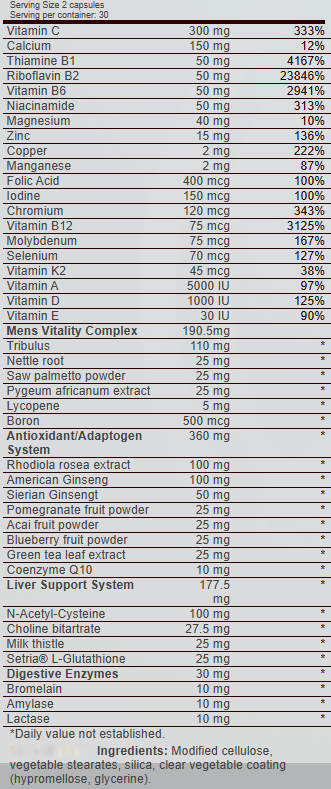 專為男士而設計,針對刻苦鍛鍊,可準確支持運動表現和整體健康所需- 含有特定微量營養素混合物,多種關鍵維他命和礦物質