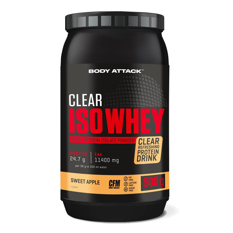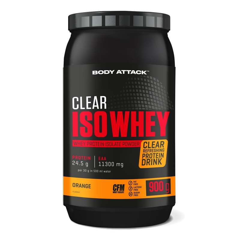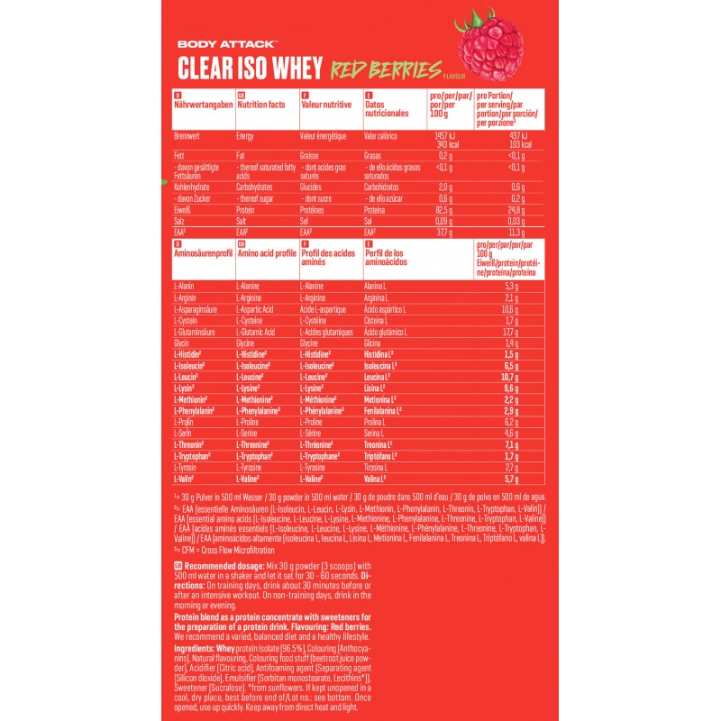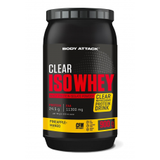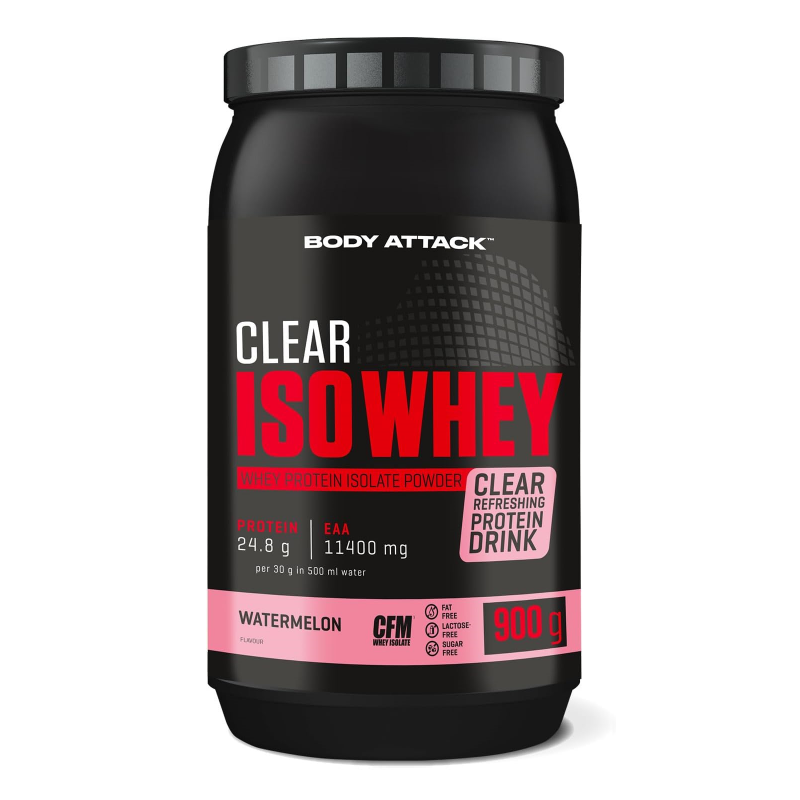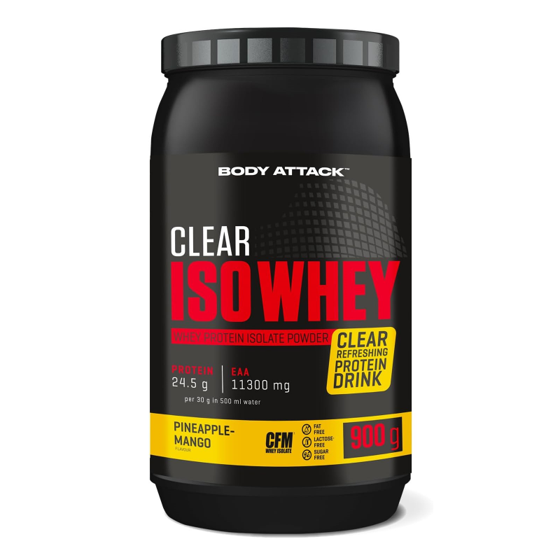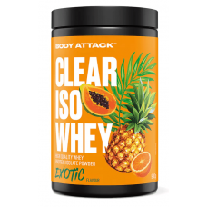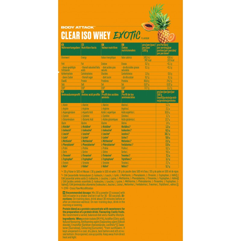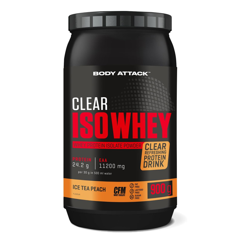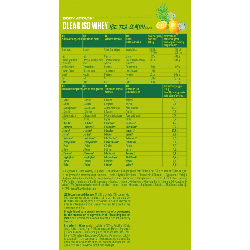 Body Attack Clear Iso Whey 透明乳清蛋白粉為你帶來清爽果汁風味的全新選擇,告別傳統濃稠奶昔!試試 9 種水果口味,找到你最喜歡的專屬口味。每份(30 克)含約 25 克蛋白質與約11,400毫克必需胺基酸(EAAs),助你有效增肌!在你完成最佳表現後,給身體補充所需的建材,幫助肌肉修復與成長。每一杯Clear Iso Whey都含有高品質的 CFM 分離乳清蛋白,不含糖分、脂肪與基因改造成分,讓你的表現始終保持巔峰!