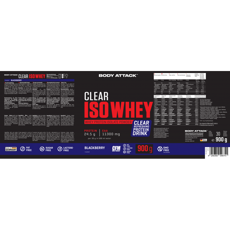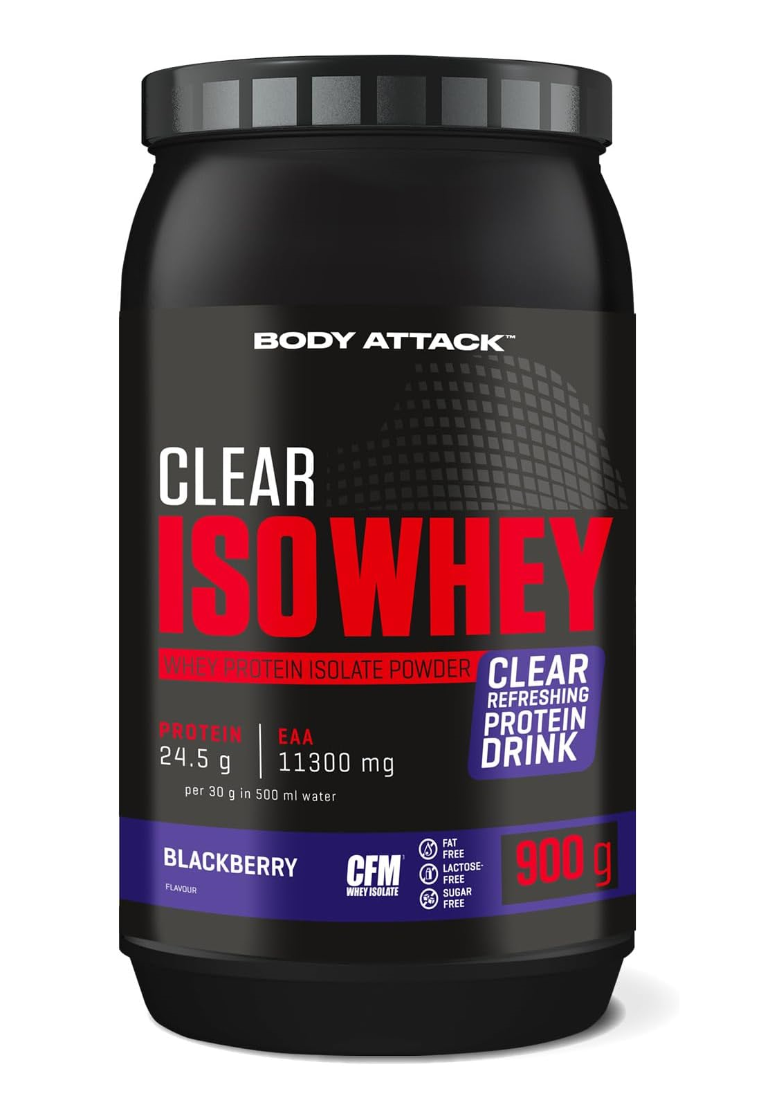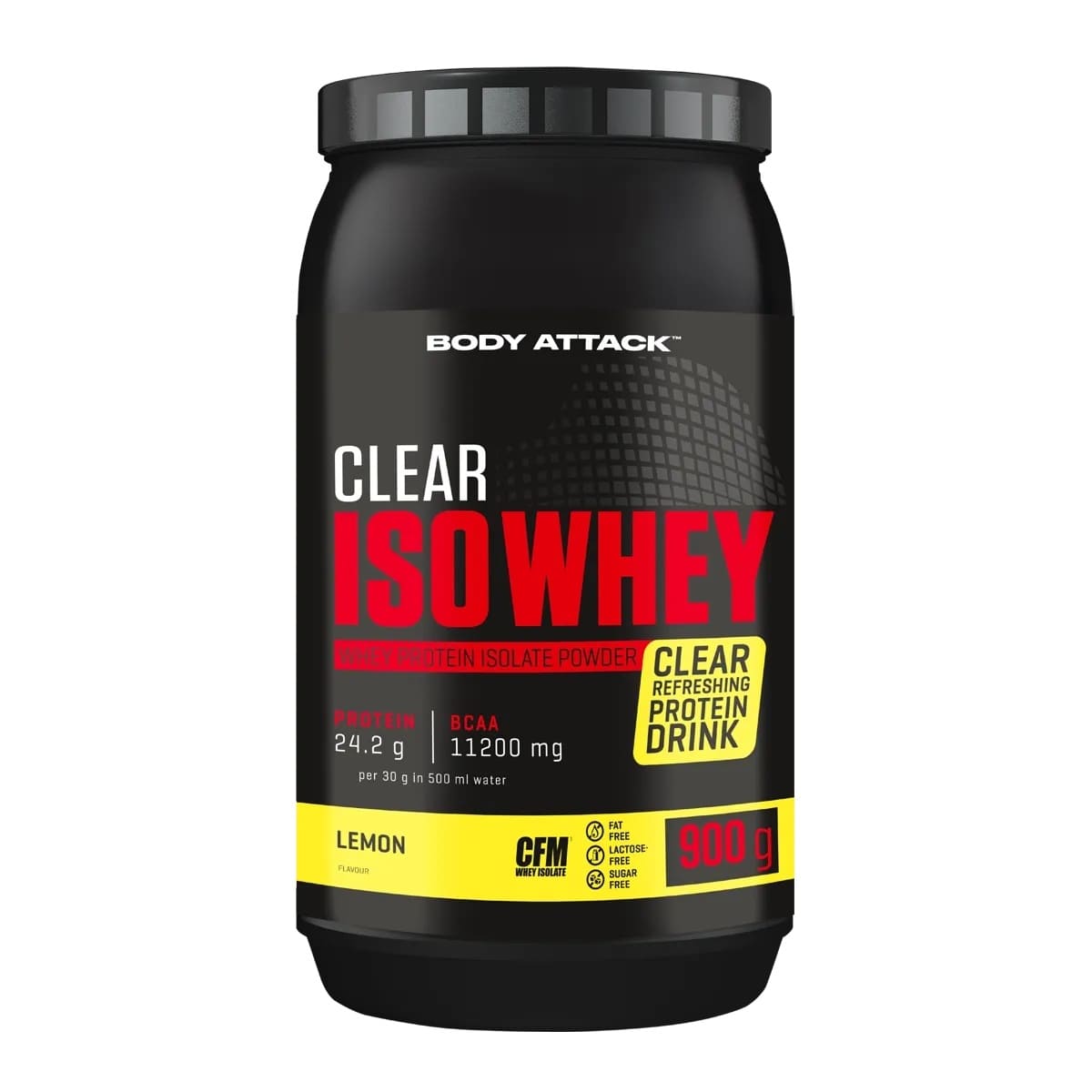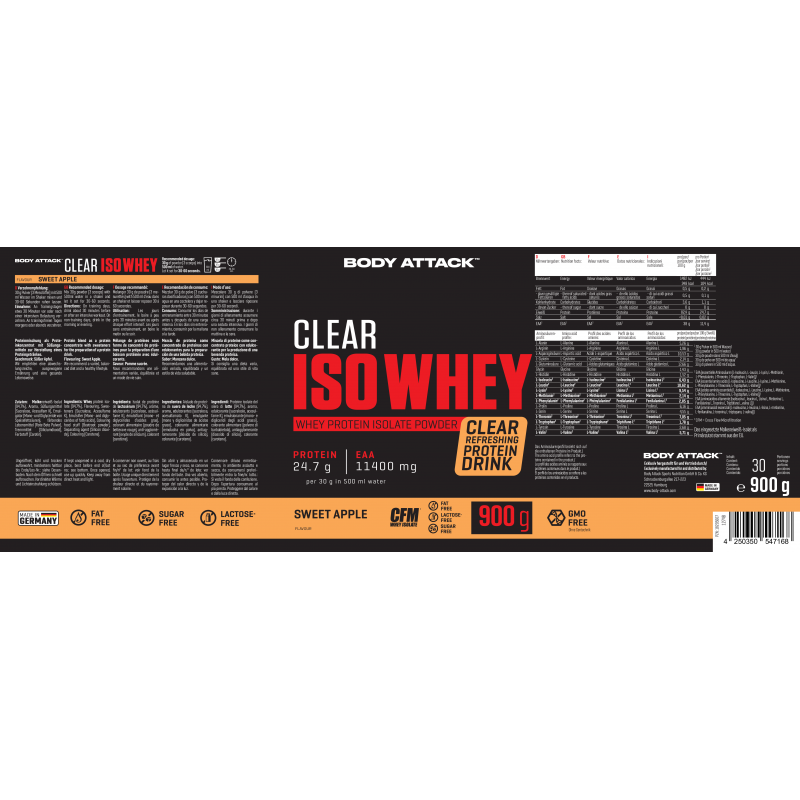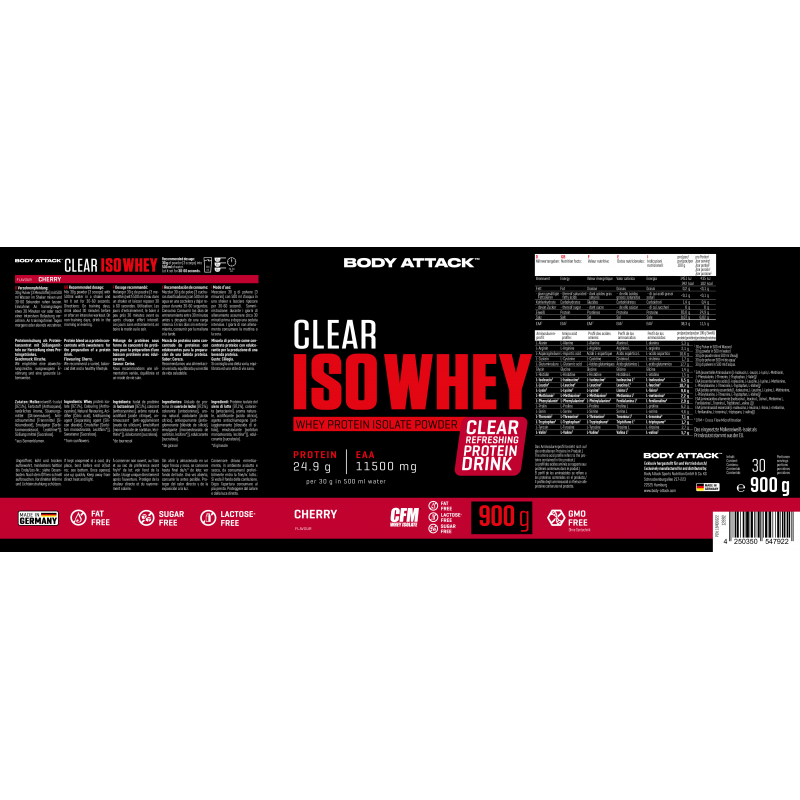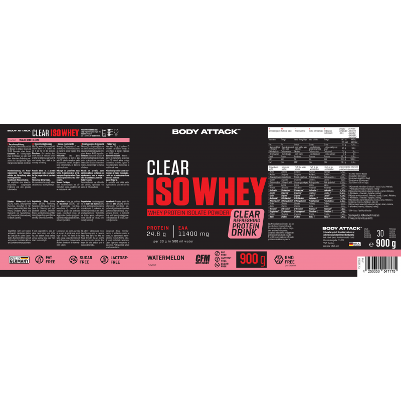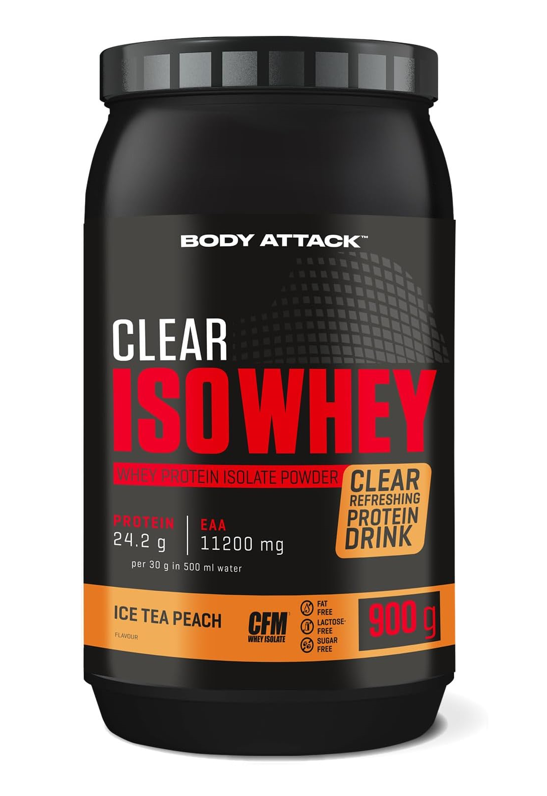 Body Attack Clear Iso Whey 透明乳清蛋白粉為你帶來清爽果汁風味的全新選擇,告別傳統濃稠奶昔!試試 9 種水果口味,找到你最喜歡的專屬口味。每份(30 克)含約 25 克蛋白質與約11,400毫克必需胺基酸(EAAs),助你有效增肌!在你完成最佳表現後,給身體補充所需的建材,幫助肌肉修復與成長。每一杯Clear Iso Whey都含有高品質的 CFM 分離乳清蛋白,不含糖分、脂肪與基因改造成分,讓你的表現始終保持巔峰!