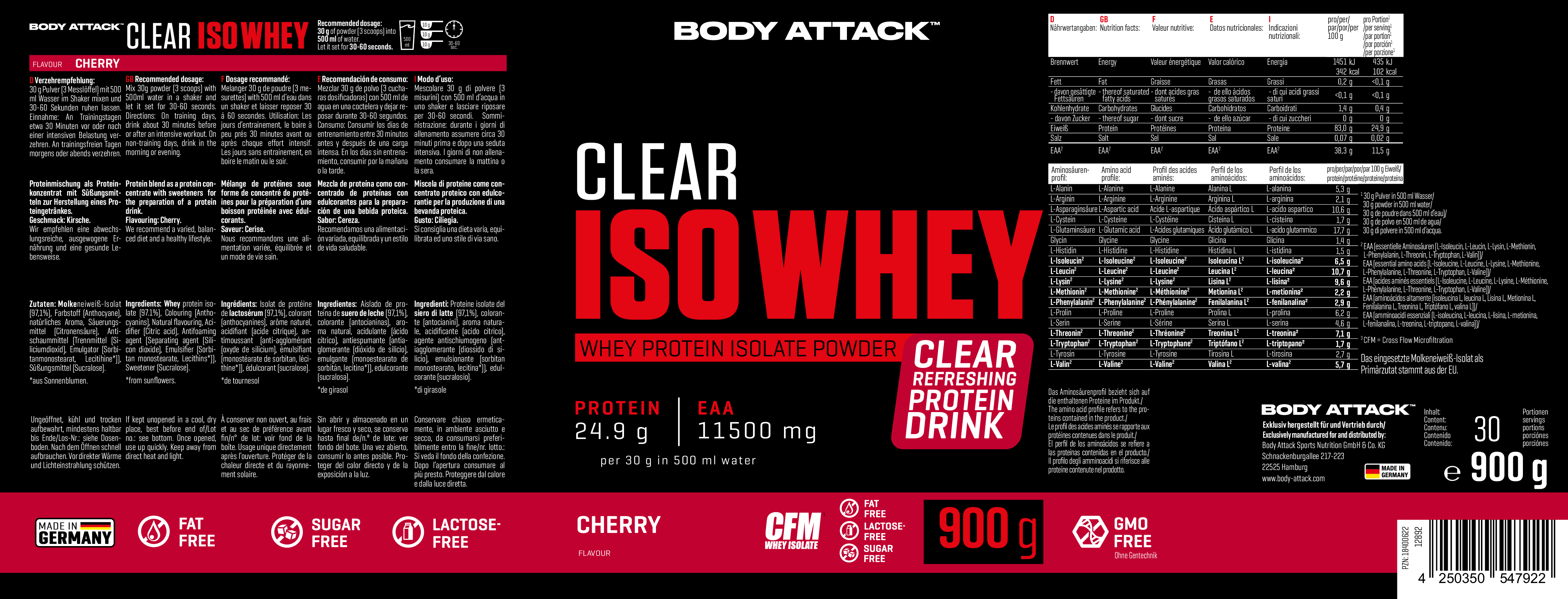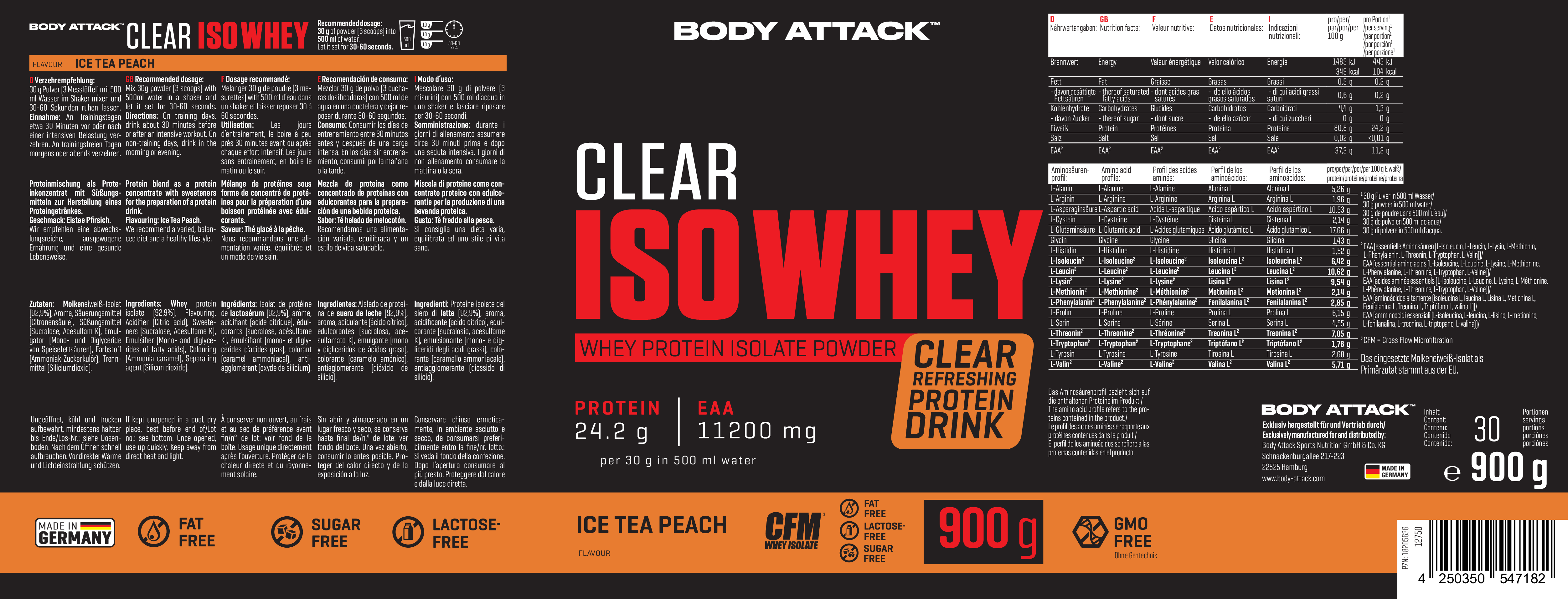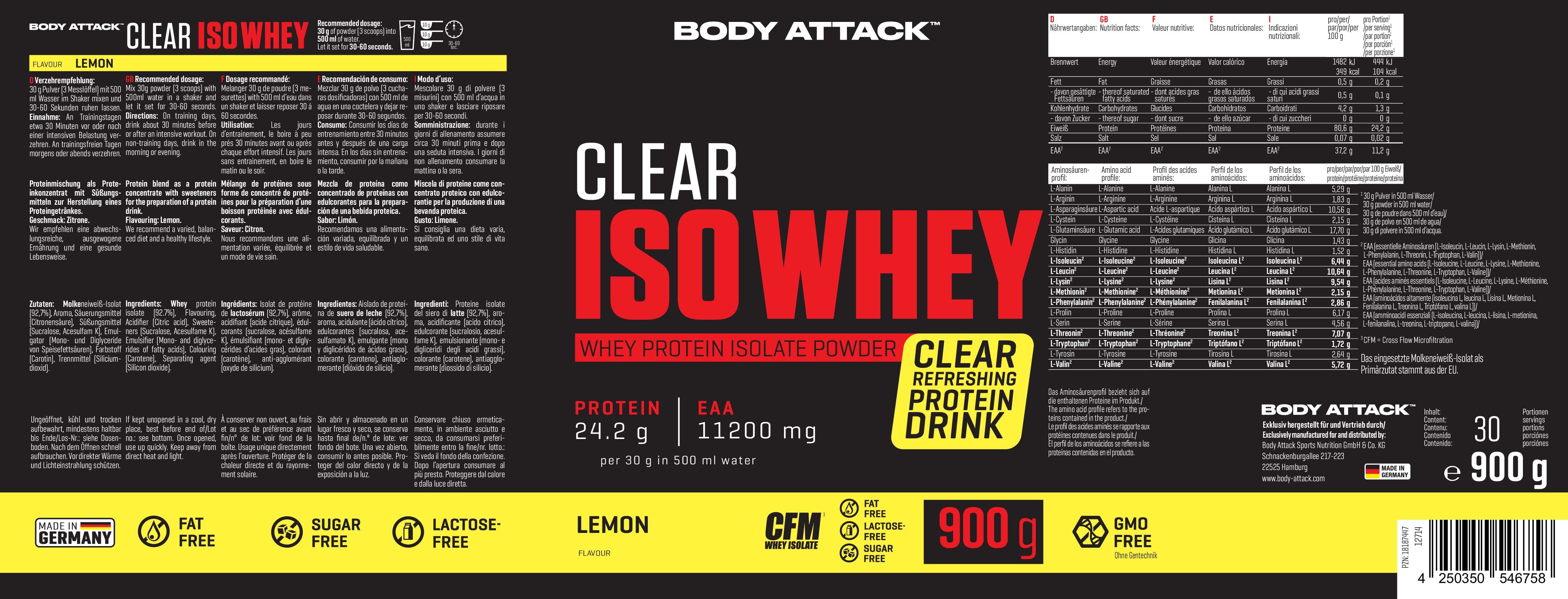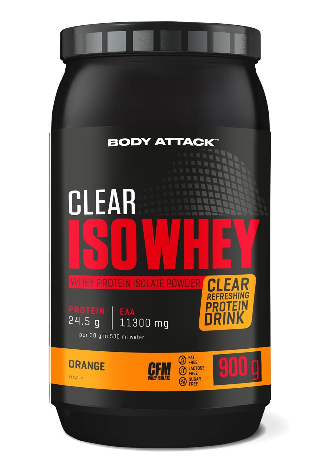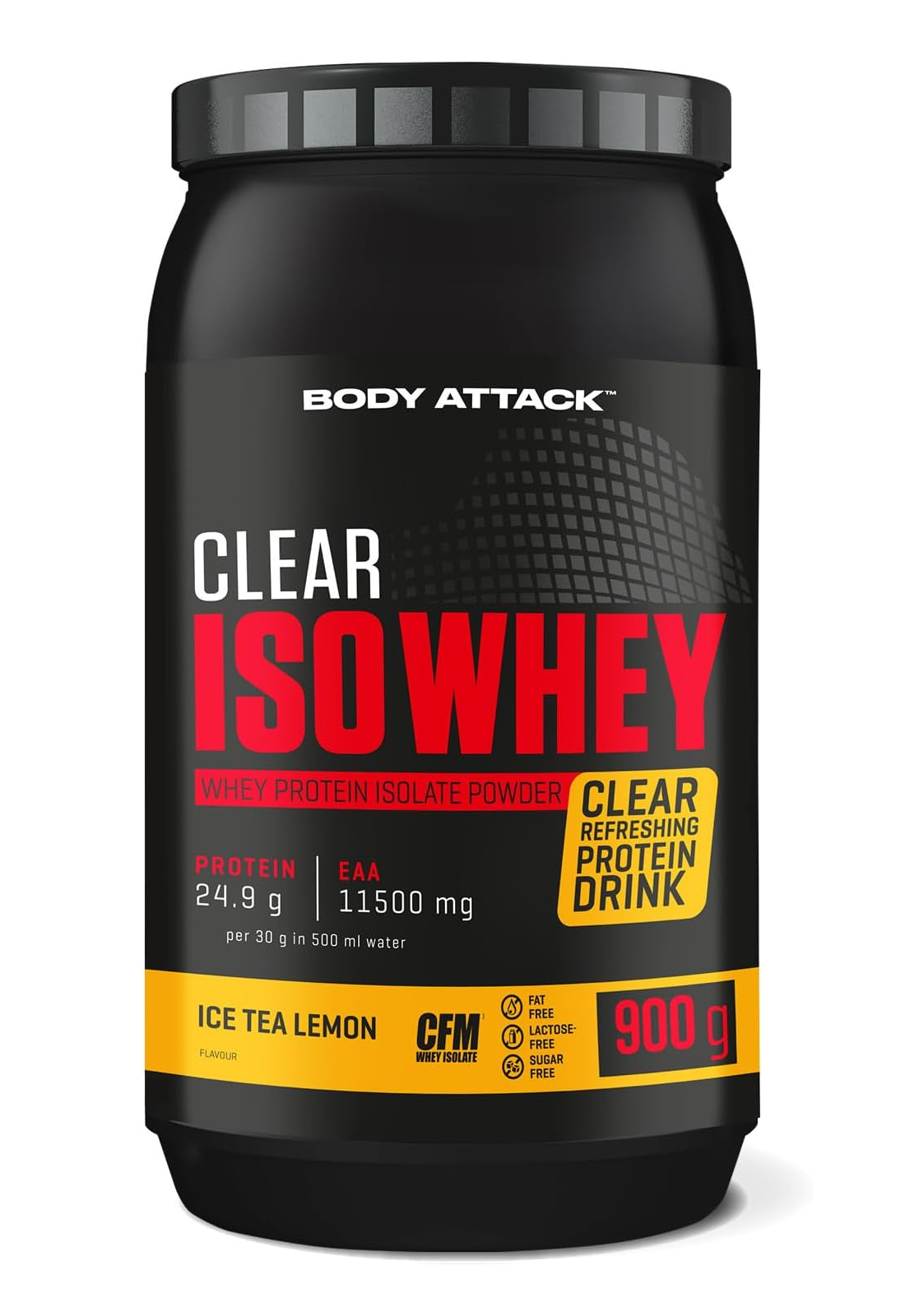 Body Attack Clear Iso Whey 透明乳清蛋白粉為你帶來清爽果汁風味的全新選擇,告別傳統濃稠奶昔!試試 9 種水果口味,找到你最喜歡的專屬口味。每份(30 克)含約 25 克蛋白質與約11,400毫克必需胺基酸(EAAs),助你有效增肌!在你完成最佳表現後,給身體補充所需的建材,幫助肌肉修復與成長。每一杯Clear Iso Whey都含有高品質的 CFM 分離乳清蛋白,不含糖分、脂肪與基因改造成分,讓你的表現始終保持巔峰!