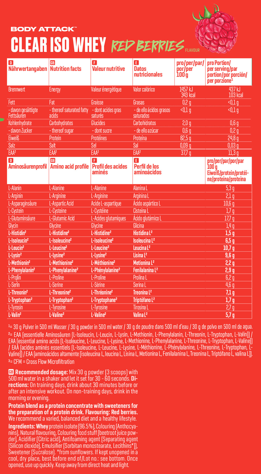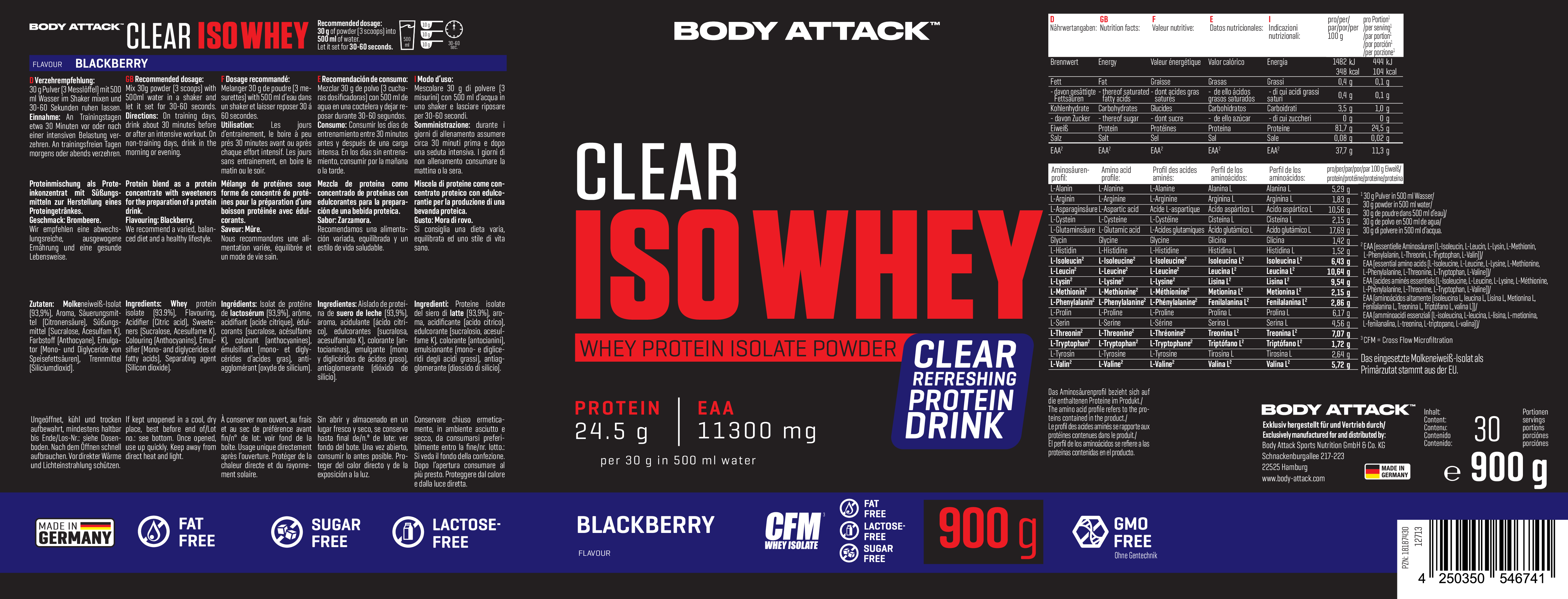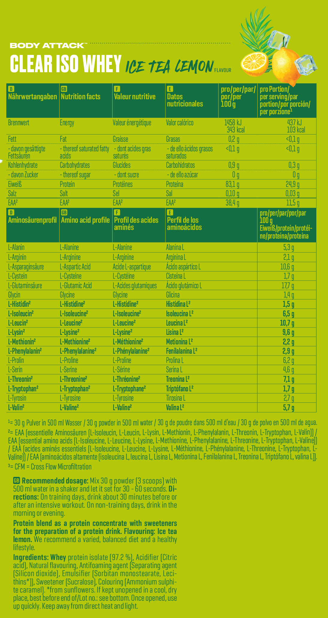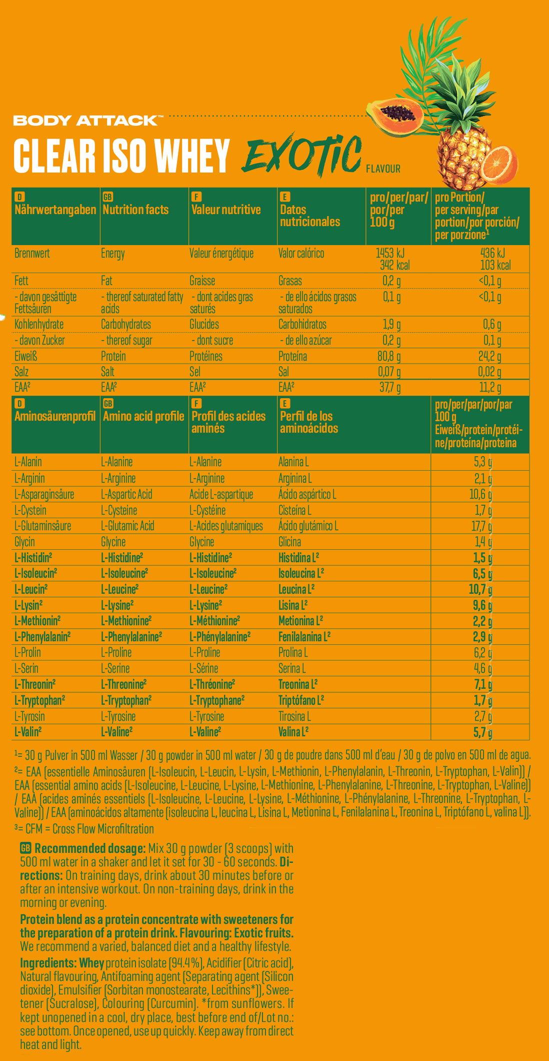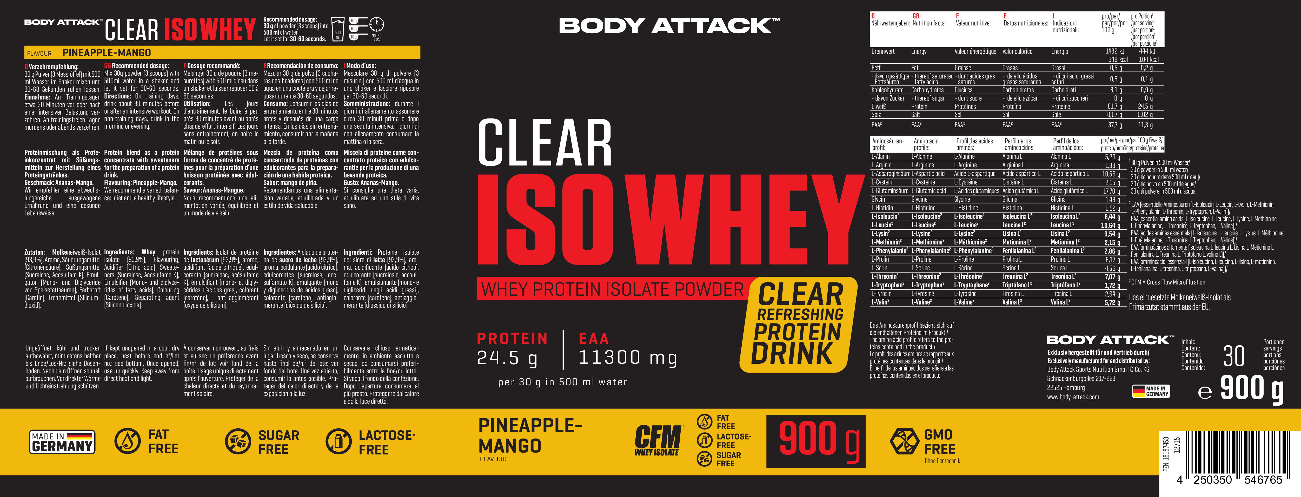 Body Attack Clear Iso Whey 透明乳清蛋白粉為你帶來清爽果汁風味的全新選擇,告別傳統濃稠奶昔!試試 9 種水果口味,找到你最喜歡的專屬口味。每份(30 克)含約 25 克蛋白質與約11,400毫克必需胺基酸(EAAs),助你有效增肌!在你完成最佳表現後,給身體補充所需的建材,幫助肌肉修復與成長。每一杯Clear Iso Whey都含有高品質的 CFM 分離乳清蛋白,不含糖分、脂肪與基因改造成分,讓你的表現始終保持巔峰!